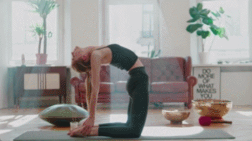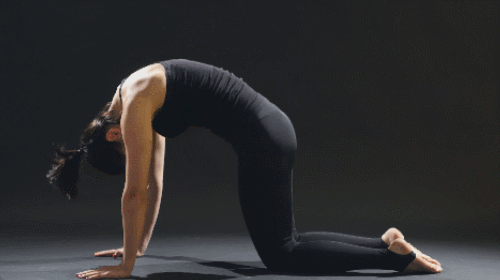 매트에 엎드려서 무릎을 바닥에 지탱하세요. 머리를 들고, 허리를 바닥으로 내려줍니다. 이번에는 머리를 내리면서 등을 공중으로 말아줍니다. 2가지 동작을 반복하면 되는데요. 1분 동안 운동하고, 호흡을 유지합니다.