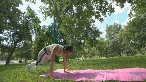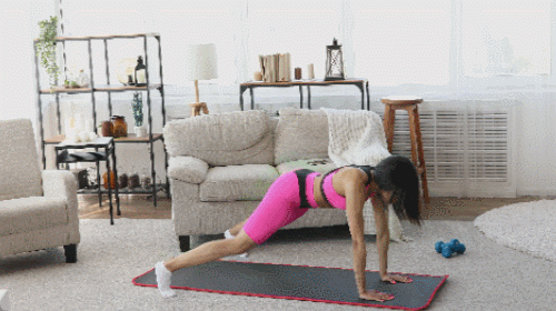 매트에 플랭크 기본자세로 엎드리세요. 오른쪽 무릎을 당겼다가 되돌리면서 왼쪽 무릎을 당겨줍니다. 무릎을 번갈아 빠르게 당겨주면 되는데요. 팔꿈치는 펴주고, 시선은 바닥을 바라봅니다. 1분 동안 진행하세요.