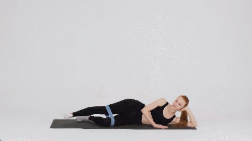 왼쪽 측면을 옆으로 대고 누워서 시작합니다. 왼손은 머리를 지탱하고, 오른손은 바닥에 댑니다. 오른쪽 다리를 공중으로 들었다가 내리면서 30초 동안 운동합니다. 이번에는 자세를 바꿔서 반대편으로 눕습니다. 왼쪽 다리를 들었다가 내리면서 30초 운동하세요. 밴드를 활용하면, 운동 효과를 높일 수 있습니다.