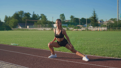 바닥에 서서 다리를 최대한 넓게 벌려줍니다. 왼쪽 무릎을 구부리면서 상체를 왼쪽으로 이동합니다. 이때 오른쪽 다리는 완전히 펴주세요. 이번에는 오른쪽 무릎을 구부리면서 왼쪽 다리를 펴줍니다. 상체를 오른쪽으로 이동하세요. 1분 동안 운동합니다.