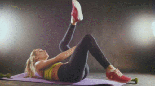 매트에 누운 상태로 손은 머리 뒤로 보내서 잡습니다. 다리는 공중으로 들고, 교차하여 버팁니다. 상체를 일으키면서 복부를 자극하고, 천천히 원래 자세로 돌아가세요. 1분 동안 반복하면 되는데요. 교차하는 발을 바꿔주면서 운동하세요.