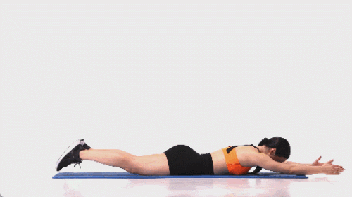 매트에 배를 대고 엎드려서 준비합니다. 팔은 앞으로 뻗으세요. 상체와 하체를 동시에 공중으로 들어 올립니다. 이때 손끝과 발끝을 최대한 뻗어주면 되는데요. 몸을 늘여준다는 느낌으로 진행합니다. 시선은 바닥을 응시하세요. 1분 동안 진행합니다.