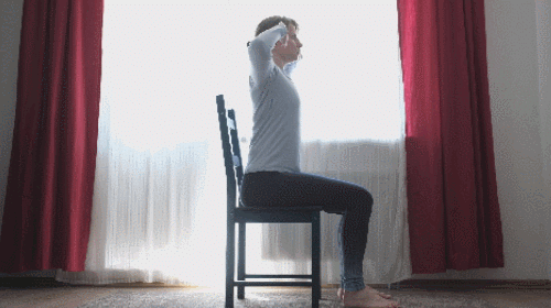 의자에 앉아서 시작하세요. 척추를 펴고, 바른 자세를 잡습니다. 손은 머리 옆으로 이동하세요. 상체를 오른쪽으로 천천히 숙였다가 돌아옵니다. 상체를 왼쪽으로 숙였다가 돌아오세요. 상체를 좌우로 움직이면서 스트레칭합니다. 1분 동안 진행하세요.