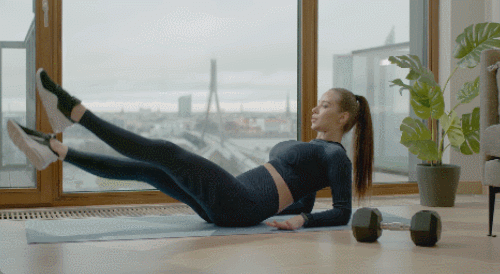 매트에 누운 상태에서 손을 머리 뒤로 보내서 잡습니다. 다리는 공중으로 들고, 무릎을 90도로 구부리세요. 상체를 일으켰다가 내리는 동작을 반복하면 되는데요. 목에 많은 힘이 가지 않도록 주의합니다. 1분 동안 진행하세요.