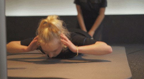 매트에 배를 대고 엎드려서 준비하세요. 손을 머리 뒤로 보내서 잡아줍니다. 상체를 공중으로 드는 동작을 반복하면 되는데요. 하체는 바닥에 그대로 고정합니다. 1분 동안 상체를 드는 동작을 반복하세요.