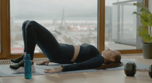 매트에 누운 상태에서 무릎을 세우고, 발은 바닥에 고정합니다. 팔을 바닥으로 누르면서 몸을 공중으로 띄우세요. 몸을 사선으로 만들고 천천히 바닥으로 내립니다. 다시 엉덩이를 들었다가 내리는 동작을 진행하세요. 1분간 운동합니다.