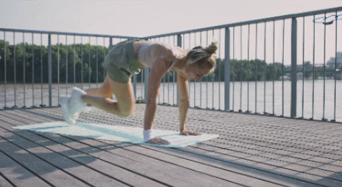 매트에 엎드려서 플랭크 자세로 시작합니다. 오른쪽 무릎을 왼쪽 팔꿈치를 향해 당겼다가 되돌리세요. 왼쪽 무릎을 오른쪽 팔꿈치로 당겼다가 되돌립니다. 다리를 번갈아 크로스 방향으로 당겨주면 되는데요. 1분 동안 운동합니다. 팔꿈치는 편 상태를 유지하세요.