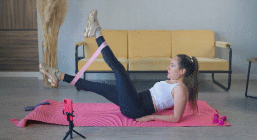매트에 누워서 팔뚝으로 몸을 지탱합니다. 상체를 일으키세요. 다리는 공중으로 띄웁니다. 왼발을 공중으로 들었다가 내리면서 오른발을 공중으로 들어줍니다. 다리를 교차하는 동작을 반복하세요. 1분 동안 운동합니다. 밴드를 활용하면, 운동 효과를 높일 수 있습니다.