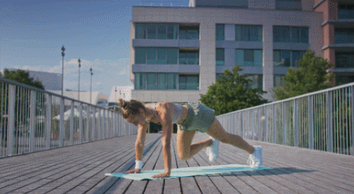 플랭크 기본자세로 매트에 엎드립니다. 오른발을 당기고, 왼발을 당겨서 네발기기 자세로 전환하세요. 다시 발을 차례로 원래 자세로 돌아가면 1회가 완료됩니다. 1분 동안 반복하세요. 플랭크 업다운 동작을 추가할 수 있습니다.