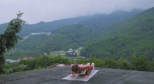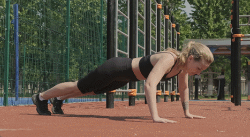 매트에 엎드려서 팔을 벌려줍니다. 팔꿈치를 구부리면서 몸을 전체적으로 바닥으로 내렸다가 천천히 돌아오세요. 근력이 부족하면, 무릎을 바닥에 대고 진행하세요. 시선은 바닥으로 향합니다. 1분간 반복합니다.