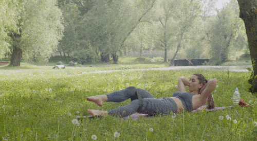 매트에 누운 상태에서 손은 머리 뒤로 보냅니다. 상체를 일으켜서 복부를 자극하세요. 오른쪽 무릎을 당기는 동작을 반복합니다. 30초 운동하세요. 이번에는 왼쪽 무릎을 당기는 동작으로 연결하세요. 30초 진행합니다. 상체는 든 상태를 유지하세요.