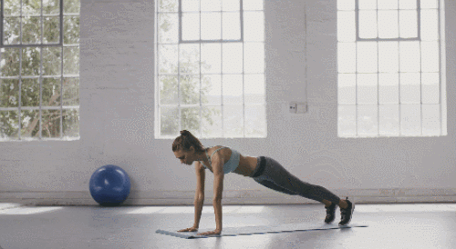 매트에 플랭크 자세로 엎드려서 준비합니다. 오른쪽 팔꿈치를 구부리고, 왼쪽 팔꿈치를 구부립니다. 팔뚝으로 몸을 지탱하는 팔꿈치 플랭크 자세를 만듭니다. 팔꿈치를 차례로 펴고 원래 자세로 돌아옵니다. 1분 동안 업다운 동작을 이어가세요.