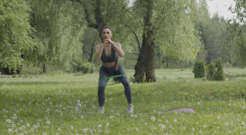 매트에 서서 허벅지에 밴드를 착용합니다. 무릎을 구부리면서 스쿼트 자세를 만드세요. 손은 가슴 앞에서 잡아줍니다. 자세를 유지하면서 오른쪽으로 이동했다가 돌아오세요. 이번에는 왼쪽으로 이동합니다. 1분간 좌우로 움직이세요.