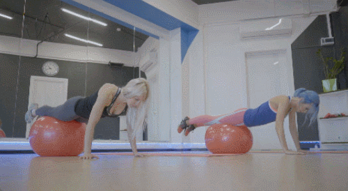 짐볼에 발을 올리고 엎드려서 플랭크 자세를 잡습니다. 팔꿈치를 완전히 펴고, 시선은 바닥을 바라봅니다. 발을 당기면서 짐볼을 끌었다가 원래 자세로 돌아가세요. 1분 동안 반복합니다. 균형을 유지하면서 운동하세요.