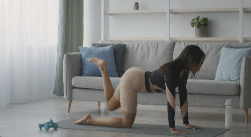 매트에 네발기기 자세로 엎드려서 준비합니다. 왼쪽 다리를 공중으로 뻗어주세요. 팔꿈치는 완전히 뻗고, 시선은 바닥을 응시합니다. 다리를 들었다가 내리면서 30초 운동합니다. 이번에는 오른쪽 다리를 공중으로 뻗고, 30초 동안 반복하세요. 무릎은 90도 각도를 유지합니다.