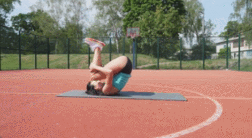 매트에 앉아서 몸을 뒤로 구릅니다. 팔을 옆으로 펼치면서 다리는 최대한 공중으로 들어줍니다. 원래 자세로 돌아오면서 몸을 일으켜 세웁니다. 구르는 동작을 1분 동안 반복하세요.
