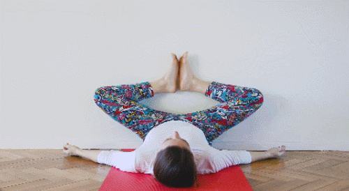 벽 앞에 매트에 눕습니다. 다리를 벽에 기대고 자세를 준비하세요. 팔은 옆으로 펼쳐서 편하게 둡니다. 무릎을 구부리고, 발을 당겨서 자세를 잡습니다. 자세를 유지하면서 호흡하세요. 1분 동안 스트레칭을 진행합니다. 몸을 충분히 풀어주세요.