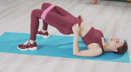 매트에 누운 상태에서 허벅지 사이에는 밴드를 끼웁니다. 무릎을 당겨서 세우고, 발은 바닥에 붙이세요. 엉덩이를 들어서 브릿지 자세를 만듭니다. 자세를 유지하면서 다리를 벌렸다가 오므리세요. 1분 동안 반복합니다. 엉덩이를 자극하세요.