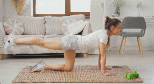 매트에 네발기기 자세로 엎드립니다. 손바닥과 무릎을 바닥에 지탱하세요. 오른발을 뒤로 뻗어줍니다. 무릎을 구부리면서 다리를 접었다가 펴는 동작을 반복하세요. 30초 운동합니다. 왼발을 뒤로 뻗으세요. 무릎을 구부리면서 반복 운동합니다. 30초 진행하세요.