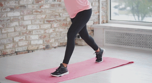 매트에 서서 준비합니다. 왼쪽 다리를 앞으로 뻗으세요. 무릎을 구부리면서 런지 동작을 진행합니다. 손은 가슴 앞에서 잡아줍니다. 30초 동안 반복하세요. 이번에는 오른쪽 다리를 앞으로 뻗습니다. 무릎을 90도로 구부리세요. 런지 동작을 30초 진행하세요.