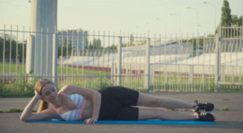 매트에 오른쪽 측면으로 누워서 준비합니다. 오른손은 머리를 지탱하세요. 왼손은 바닥에 둡니다. 오른쪽 다리를 공중으로 들었다가 내리면서 운동하세요. 30초 진행합니다. 반대편으로 돌아서 눕습니다. 왼쪽 다리를 들었다가 내리면서 30초 반복하세요.