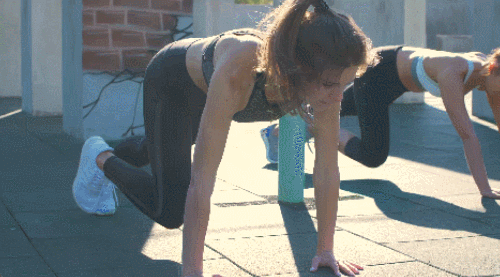매트에 플랭크 기본자세로 엎드리세요. 오른쪽 무릎을 당겼다가 되돌리면서 왼쪽 무릎을 당겨줍니다. 무릎을 번갈아 빠르게 당겨주면 되는데요. 팔꿈치는 펴주고, 시선은 바닥을 바라봅니다. 1분 동안 진행하세요.