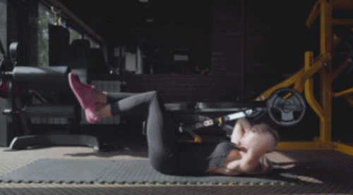 매트에 누워서 손은 머리 옆으로 옮깁니다. 다리는 들고, 무릎을 구부리세요. 발은 교차하여 줍니다. 상체를 일으키면서 복부 전체를 압박했다가 천천히 원래 자세로 돌아갑니다. 1분 동안 반복하세요. 다리는 든 상태를 유지합니다.