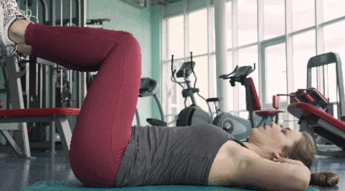 매트에 누워서 손을 머리 옆으로 옮기세요. 다리는 공중으로 들고, 무릎을 90도 각도로 구부립니다. 상체를 천천히 일으켰다가 내리면서 복부를 자극하면 되는데요. 1분 동안 진행합니다. 다리는 든 상태를 계속 유지하세요.