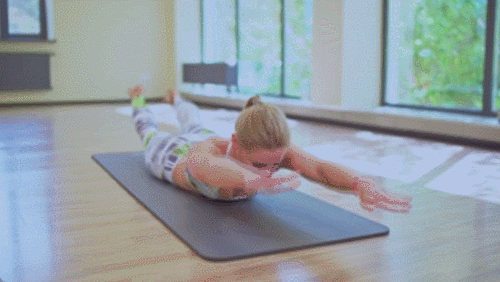 매트에 배를 대고 엎드려서 시작하세요. 손을 바닥으로 누르면서 상체를 일으켜 세웁니다. 골반은 바닥에 붙인다는 생각으로 진행하면 되는데요. 상체를 열면서 확장시키고, 척추를 늘여주세요. 1분 동안 코브라 자세를 반복합니다.