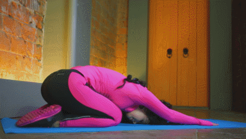 매트에 무릎을 꿇고 엎드립니다. 손을 뻗으세요. 이마는 바닥에 붙이고, 엉덩이를 발꿈치에 완전히 붙입니다. 상체를 세우면서 골반을 바닥에 붙이고, 코브라 자세로 전환합니다. 1분 동안 2가지 자세를 반복하세요.