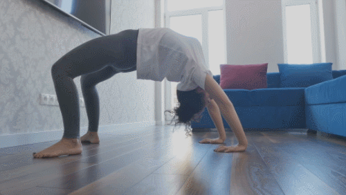 매트에 등을 대고 눕습니다. 손과 발을 바닥으로 누르면서 몸을 띄웁니다. 아치 형태로 만드세요. 머리를 뒤로 젖혀서 스트레칭을 강화합니다. 팔꿈치를 펴고, 자세를 유지하며 호흡하세요. 1분 동안 운동합니다. 신체 상태에 따라 각도를 조절합니다.