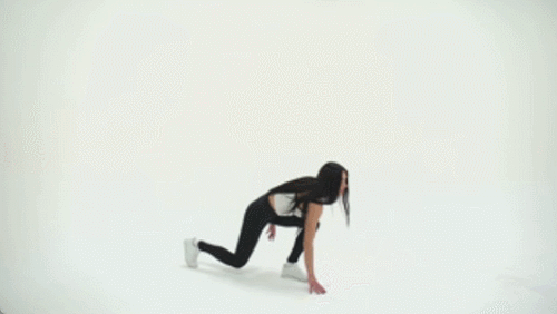 다리를 모으고 선 상태에서 오른쪽 다리를 뒤로 뻗어서 무릎을 구부리는 리버스 런지 자세를 만듭니다. 동시에 상체를 숙여서 오른손으로 바닥을 터치하세요. 상체를 일으키면서 오른쪽 무릎을 당겨서 공중으로 올리고, 왼손을 머리 위로 뻗습니다. 30초 반복하세요. 다리와 손 위치를 바꿔서 30초 반복합니다.