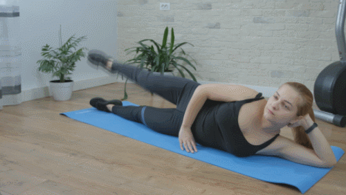매트에 왼쪽 측면을 대고 옆으로 누워서 시작합니다. 왼손은 머리를 지탱하세요. 오른쪽 다리를 공중으로 들었다가 내리면서 30초 동안 운동합니다. 오른쪽 측면으로 돌아서 누워서 준비하세요. 왼쪽 다리를 공중으로 들었다가 내리세요. 30초 반복합니다.