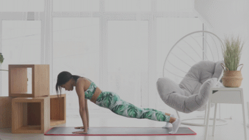 매트에 플랭크 기본자세로 엎드립니다. 엉덩이를 들면서 상체를 당겨서 다운도그 자세를 만드세요. 이때 오른손을 뻗어서 왼발을 터치하고 돌아옵니다. 이번에는 다운도그 자세에서 왼손을 뻗어서 오른발을 터치하고 돌아옵니다. 1분 동안 운동하세요.