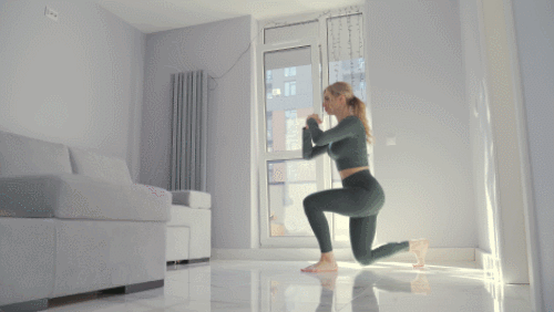 매트에 서서 준비하세요. 오른쪽 다리를 뒤로 뻗습니다. 무릎을 구부리면서 런지 동작을 진행하세요. 원래 자세로 돌아오면서 무릎을 공중으로 들어줍니다. 30초 진행하세요. 왼쪽 다리를 뒤로 뻗었다가 당기는 동작으로 반복합니다. 30초 운동합니다.