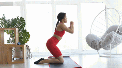 매트에 무릎을 대고 앉아서 시작합니다. 오른쪽 다리를 당겨서 발을 바닥에 짚고, 왼쪽 다리를 당겨서 발을 바닥에 짚습니다. 스쿼트 자세로 전환하세요. 다시 다리를 바닥으로 이동하면서 원래 자세로 돌아갑니다. 1분 동안 2가지 자세를 진행하세요.