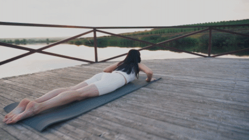 매트에 배를 대고 엎드려서 호흡을 정리합니다. 손을 바닥으로 누르면서 상체를 공중으로 일으키세요. 이때 골반은 바닥에 붙인다는 생각으로 진행합니다. 상체를 개방하면서 스트레칭을 진행합니다. 1분 동안 코브라 동작을 반복하세요.