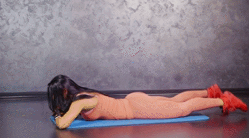 매트에 배를 대고 엎드립니다. 팔꿈치를 구부리고, 손을 턱밑으로 가져옵니다. 다리는 적당히 벌리고 발끝은 뻗어주세요. 다리를 공중으로 들었다가 내리는 동작을 반복합니다. 1분 동안 운동하세요.