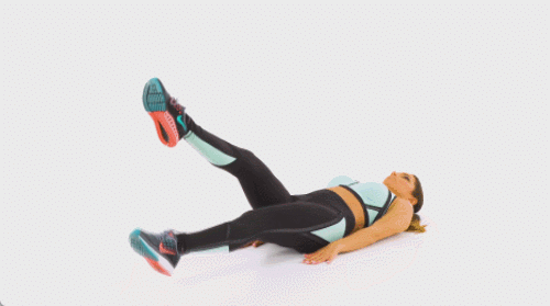 매트에 누운 상태에서 손은 머리 옆으로 옮깁니다. 다리는 공중으로 들어줍니다. 왼쪽 다리를 앞으로 뻗었다가 당기면서 오른쪽 다리를 뻗습니다. 다리를 휘저으면서 1분 동안 반복하세요. 자전거의 페달처럼 움직입니다.