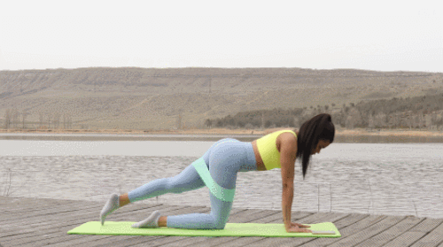 매트에 네발기기 자세로 엎드립니다. 다리에 밴드를 착용하여 운동 효과를 높이세요. 왼쪽 다리를 뒤로 뻗어줍니다. 업다운 동작을 30초 진행하세요. 오른쪽 다리를 뒤로 뻗어주세요. 30초 동안 들었다가 내리면서 운동합니다.