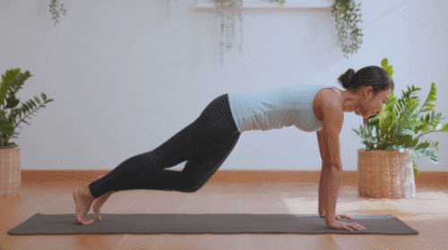매트에 플랭크 자세로 엎드립니다. 팔꿈치를 완전히 펴고, 시선은 바닥을 바라보세요. 오른쪽 무릎을 상체 방향으로 당겼다가 되돌립니다. 왼쪽 무릎을 상체로 당겼다가 되돌리세요. 자세를 유지한 상태에서 다리를 번갈아 당겨줍니다. 1분간 운동하세요.