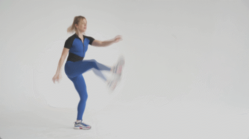 매트에 서서 준비합니다. 다리를 충분히 벌려주세요. 엉덩이를 내리면서 스쿼트 동작을 진행하세요. 원래 자세로 돌아오면서 오른발을 앞으로 뻗으세요. 이때 왼손을 뻗어서 손으로 발을 터치합니다. 반대편 발과 손으로 반복하세요. 1분간 운동합니다.