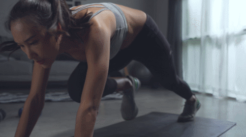 매트에 플랭크 자세로 엎드립니다. 팔꿈치를 완전히 펴고, 시선은 바닥으로 향합니다. 어깨에서 손목까지 이어지는 라인을 직선으로 맞추세요. 오른쪽 무릎을 당겼다가 되돌립니다. 왼쪽 무릎을 빠르게 당겨주세요. 무릎을 번갈아 당겨줍니다. 1분간 진행하세요.