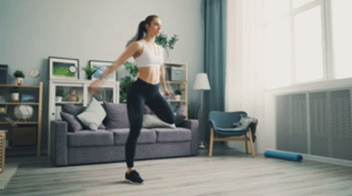 바닥에 서서 발을 모으세요. 오른쪽 다리를 뒤로 뻗으면서 런지 동작을 진행합니다. 원래 자세로 돌아오면서 무릎을 들어 올립니다. 30초 운동하세요. 왼쪽 다리를 뒤로 뻗었다가 당기면서 들어주는 동작으로 30초 반복합니다. 손은 가슴 앞에서 모았다가 내립니다.