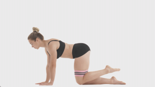 매트에 네발기기 자세로 엎드리세요. 발목에는 탄력 밴드를 추가합니다. 왼쪽 다리를 공중으로 들어 올렸다가 내리면서 킥 동작을 30초 진행하세요. 이번에는 오른쪽 다리를 들었다가 내리는 동작을 30초 반복합니다.