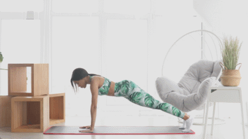 매트에 플랭크 기본자세로 엎드리세요. 오른쪽 팔꿈치를 구부리고, 왼쪽 팔꿈치를 구부려서 팔꿈치 플랭크 자세로 바꿔줍니다. 이번에는 팔꿈치를 차례로 펴고 원래 자세로 돌아오세요. 1분 동안 플랭크 업다운 동작을 반복합니다.