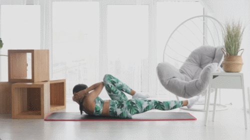 매트에 등을 대고 누워서 손은 머리 옆으로 보냅니다. 상체를 약간 일으키세요. 다리를 공중으로 들어줍니다. 이번에는 한쪽 다리를 당기면서 상체를 틀어주세요. 반대편 다리를 당기면서 상체를 틀어줍니다. 1분간 반복하세요.