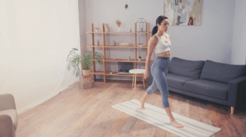 매트에 서서 준비하세요. 오른발을 앞으로 내딛습니다. 무릎을 구부리면서 런지 동작을 진행하세요. 무릎을 90도 각도로 만드세요. 손은 가슴 앞에서 모았다가 내려줍니다. 30초 운동하세요. 왼발을 앞으로 내딛고, 동일하게 30초 운동합니다.