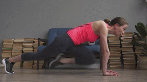 매트에 플랭크 자세로 엎드려서 시작하세요. 오른쪽 무릎을 당겼다가 되돌리면서 왼쪽 무릎을 당겨줍니다. 무릎을 번갈아 당겨주면서 속도를 점차 높이세요. 1분 동안 반복하세요. 시선은 바닥을 향합니다.