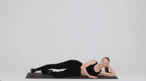 왼쪽 측면을 옆으로 대고 누워서 시작합니다. 왼손은 머리를 지탱하고, 오른손은 바닥에 댑니다. 오른쪽 다리를 공중으로 들었다가 내리면서 30초 동안 운동합니다. 이번에는 자세를 바꿔서 반대편으로 눕습니다. 왼쪽 다리를 들었다가 내리면서 30초 반복합니다.